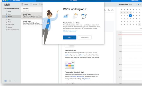 诸如“人员”,“任务”和“注释”之类的其他部分以及诸如统一收件箱之类的许多其他功能仍在进行中。如果您尝试访问它们,Outlook会显示一条消息,提示“我们正在处理中”。单击应用程序右上角的选项,您始终可以切换回旧的Outlook设计以访问这些部分。