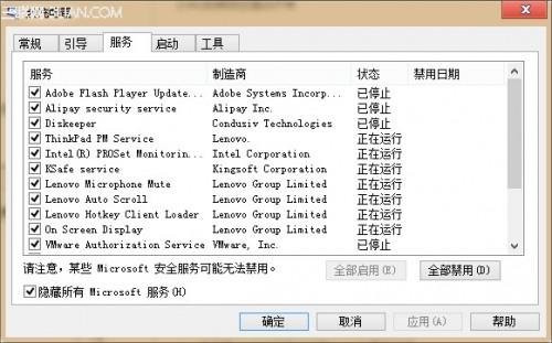 3、点击“全部禁用”按钮来禁用其余的所有服务;