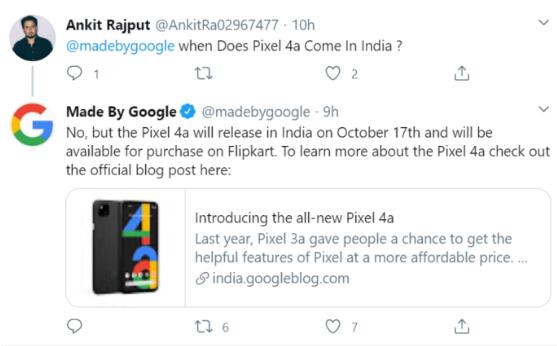 上个月在Google Pixel 4a启动后发布的Google亚洲市场博客上的官方帖子指出,它将于8月通过Flipkart在亚洲市场发布。该设备在亚洲市场的定价尚未确定。在宣布Pixel 4a 5G和Pixel 5之后不久,Google回应了一个Twitter用户,称Pixel 4a将于10月17日在亚洲市场发布。如前所述,它将通过Flipkart发售。