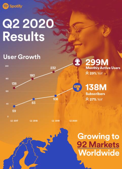 Spotify已发布其2020年第二季度业绩。服务的活跃用户数量增加到2.99亿,付费用户数量增加到1.38亿,用户数量比去年同期增长29%,比上一季度增长5%。
