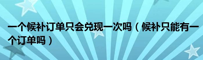 大家好,跳跳为你解答以上问题。一个候补订单只会兑现一次吗,候补只能有一个订单吗这个问题很多人还不知道,现在让我们一起来看看吧!