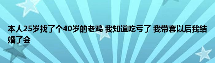 关于本人25岁找了个40岁的老鸡 我知道吃亏了 我带套以后我结婚了会这个很多人还不知道,今天菲菲来为大家解答以上的问题,现在让我们一起来看看吧!